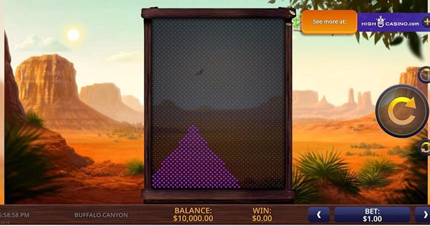Deze slot maakt gebruik van een fascinerend mechanisme dat bekend staat als Megapixel Pays, dat voor het eerst te zien was in Retro Riches. In plaats van een rooster van rollen en rijen is er een matrix van 2.400 stippen. Als zodanig zijn er geen betaallijnen. We zullen later in onze Buffalo Canyon-review bespreken hoe dit precies werkt.