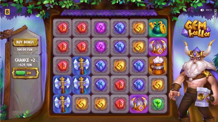 In Gemhalla zie je een 6×5 raster gevuld met edelstenen en Viking-artefacten, terwijl de Viking het spel overziet, klaar om vermenigvuldigers neer te halen met zijn hamer.