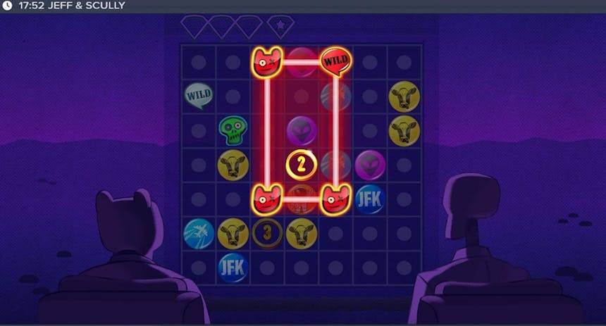 De Jeff & Scully gokkast onderscheidt zich van andere online gokkasten met zijn kenmerkende 7×7 rasteropstelling, een afwijking van de conventionele reel formaten. Wat deze gokkast bijzonder intrigerend maakt, is het unieke mechanisme voor het winnen van gebieden. Deze innovatieve aanpak betekent dat wanneer vier overeenkomende symbolen de hoeken van een rechthoek of vierkant op het raster vormen, ze een winnend gebied creëren, trapsgewijze winsten activeren en deuren openen naar potentieel lonende gameplay.