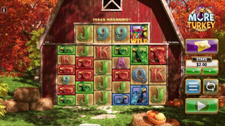 More Turkey neemt je mee naar een boerderij en het decor van het spel is een schuur. Het spel heeft een herfstgevoel, wat blijkt uit de rode bladeren aan de bomen die we op de achtergrond zien. Je ziet ook wat hooiballen en wat pompoenen, wat we leuke details vinden die zijn toegevoegd door het grafische team van Big Time Gaming.