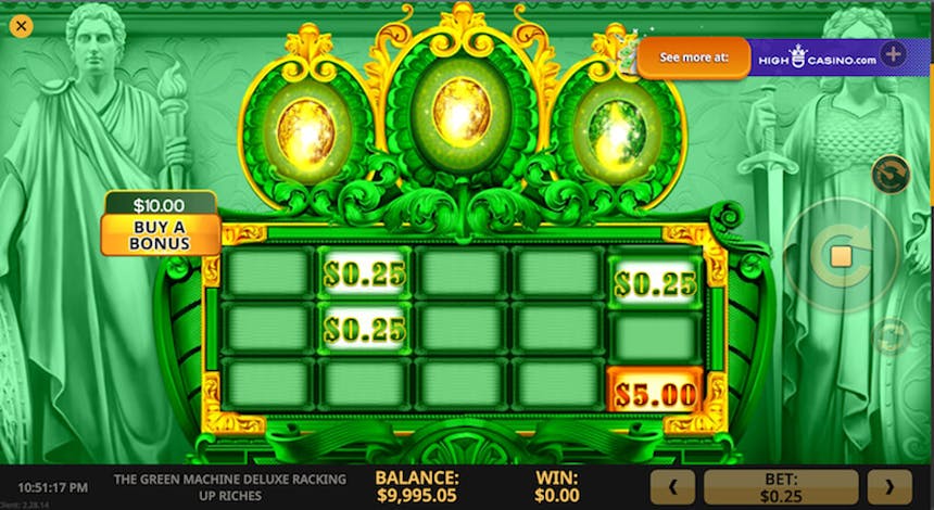 The Green Machine Deluxe: Racking Up Riches en zijn voorganger zijn heel verschillende spellen. Niet alleen qua wiskundig model en uitbetalingen, maar ook qua ontwerp. Terwijl het cash-thema overheersend blijft, doet High 5 Games afstand van de saaie visuele elementen en introduceert klassieke Romeinse verwijzingen.
